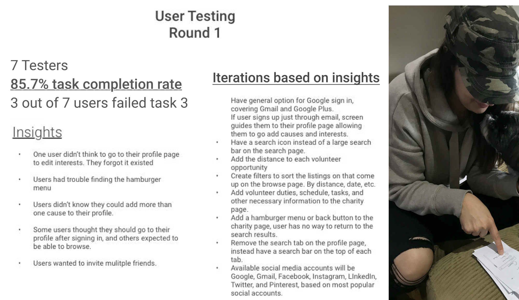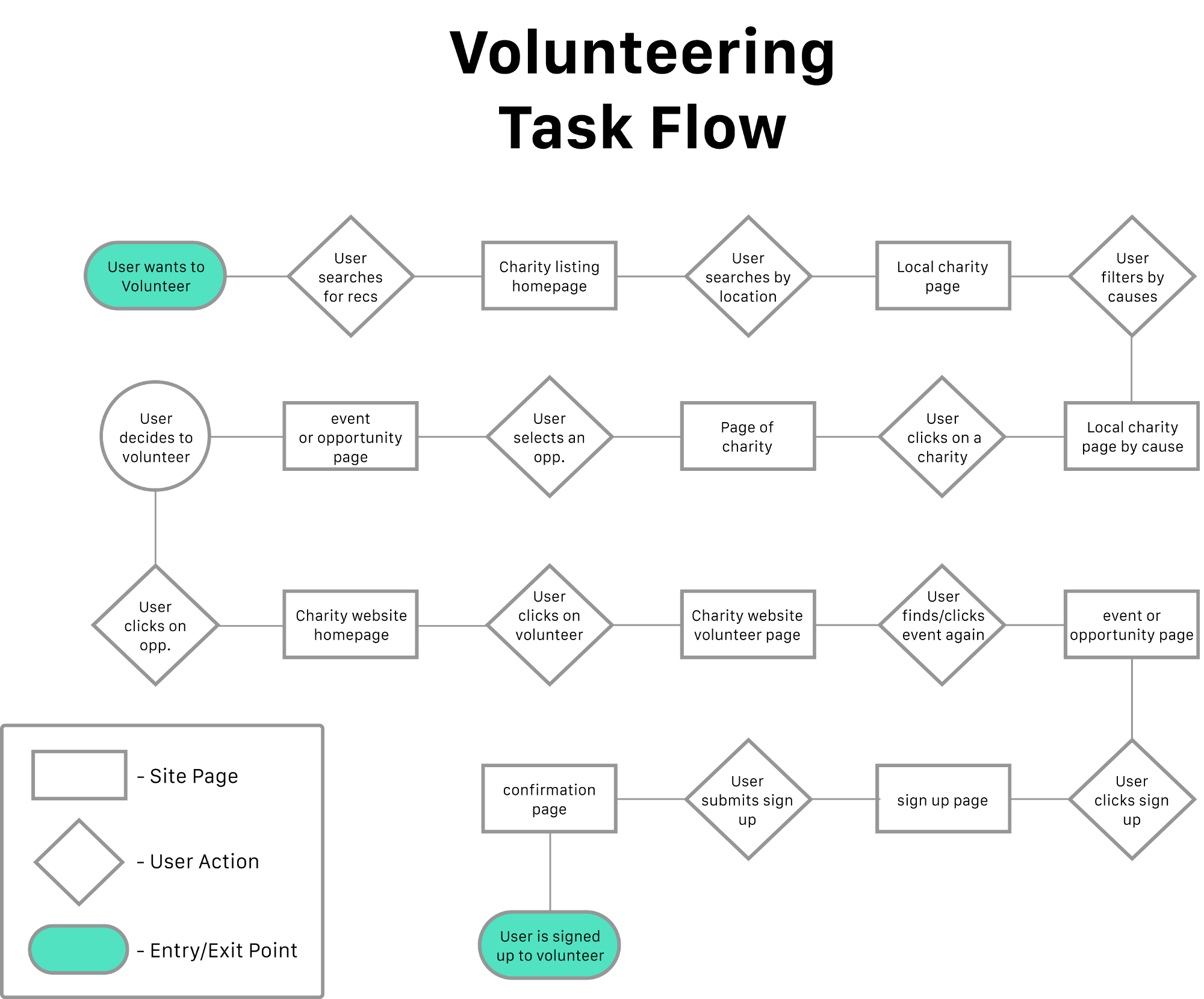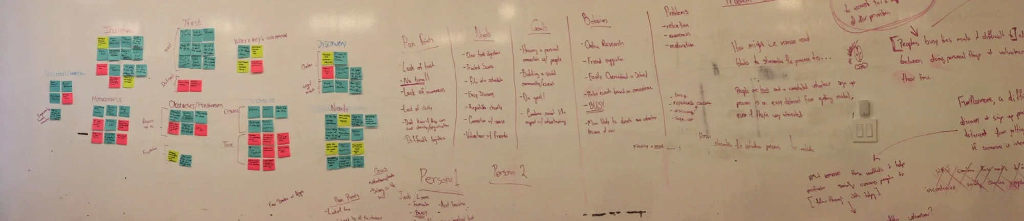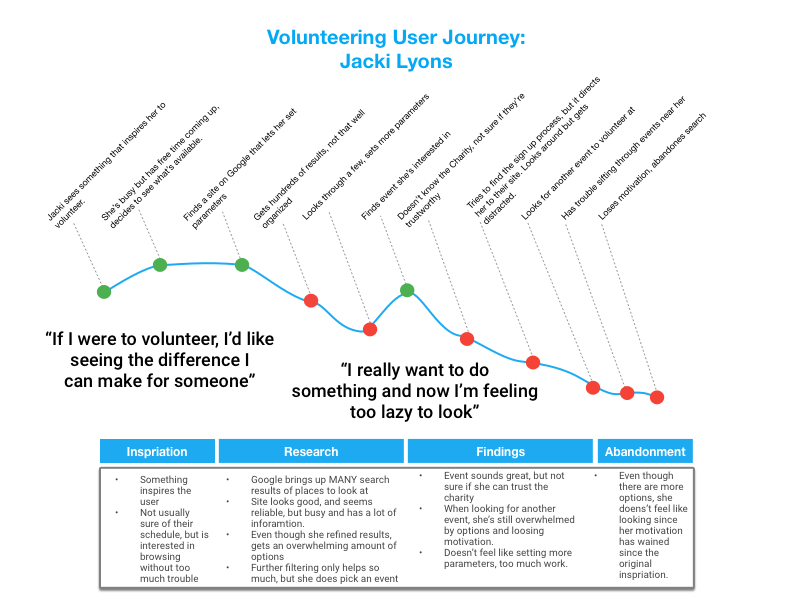 Based on the User Task Flow and our persona’s, we were able to create the User Journey, which actually helped us to actualize and empathize what it took Jacki to volunteer and what might prevent her from doing so. Building on this and other research we were able to define our Problem Statement.