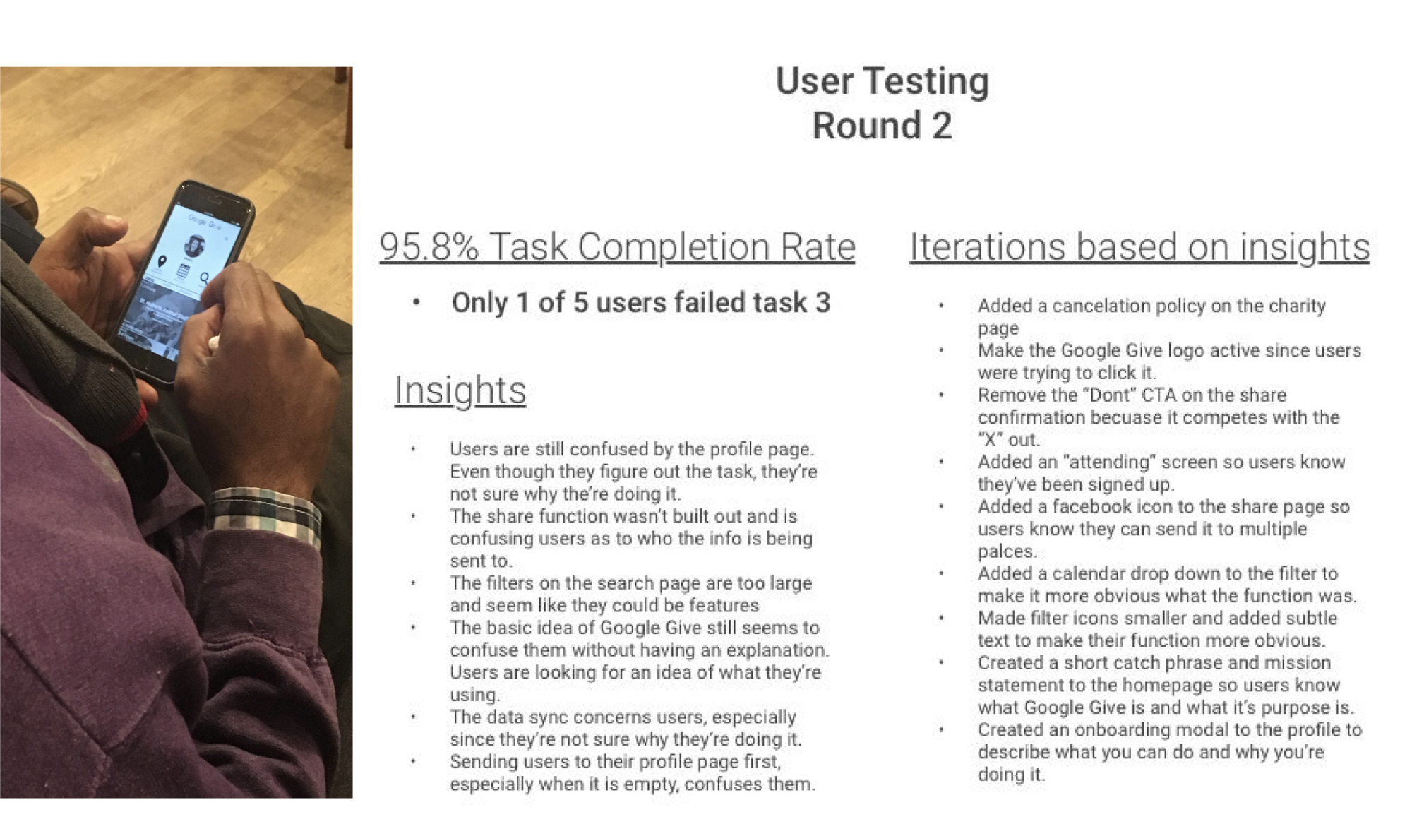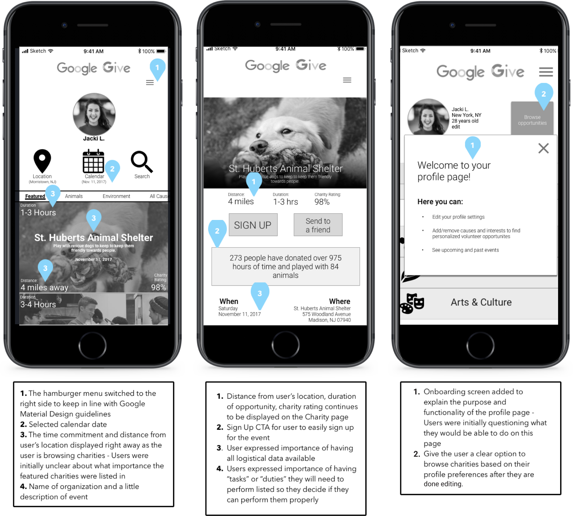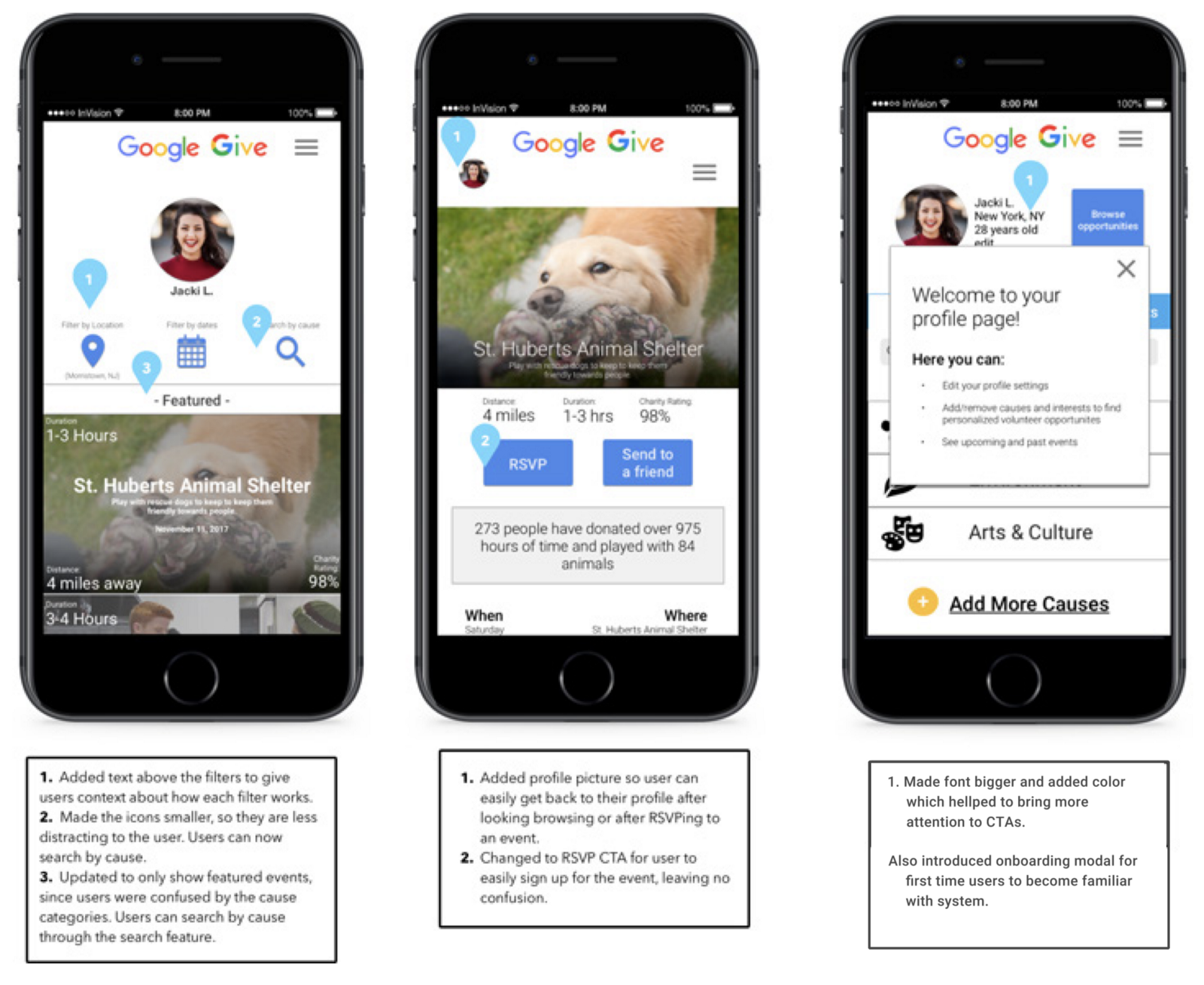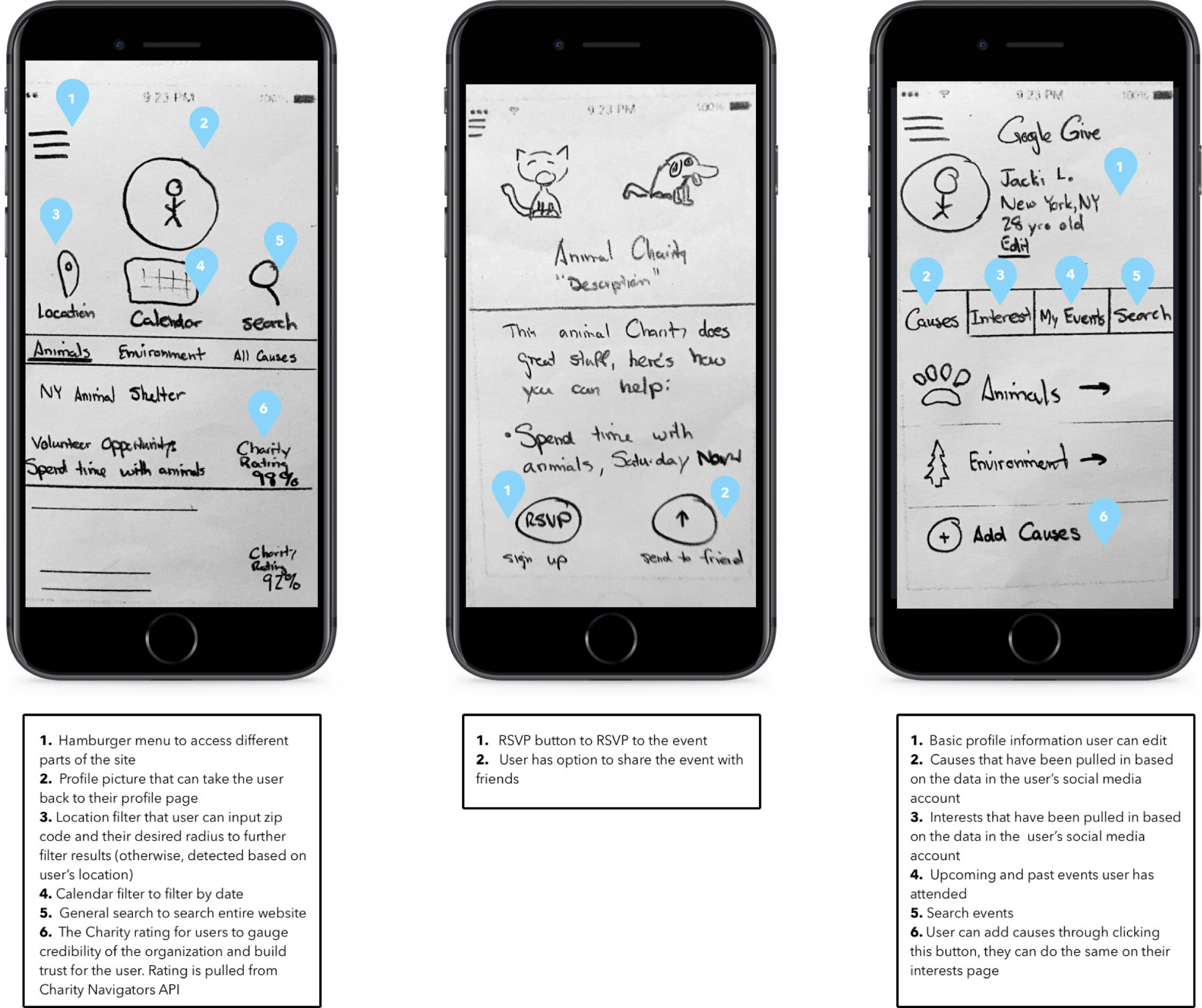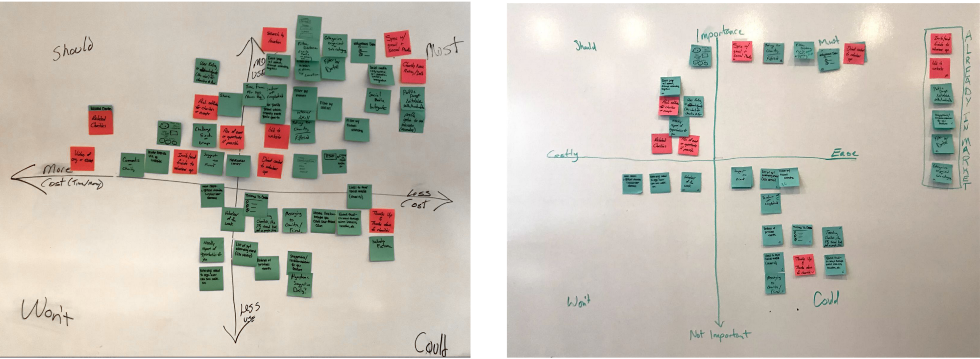 Our initial MoSCoW chart below shows many features in must and should. In general, there were many features on the chart, and as a team, we knew we had to consolidate and focus on less features in order to have a successful execution of Google Give. After grouping together duplicates and taking a hard look at the features, we reorganized some, and then were able to come up with the chart on the right.